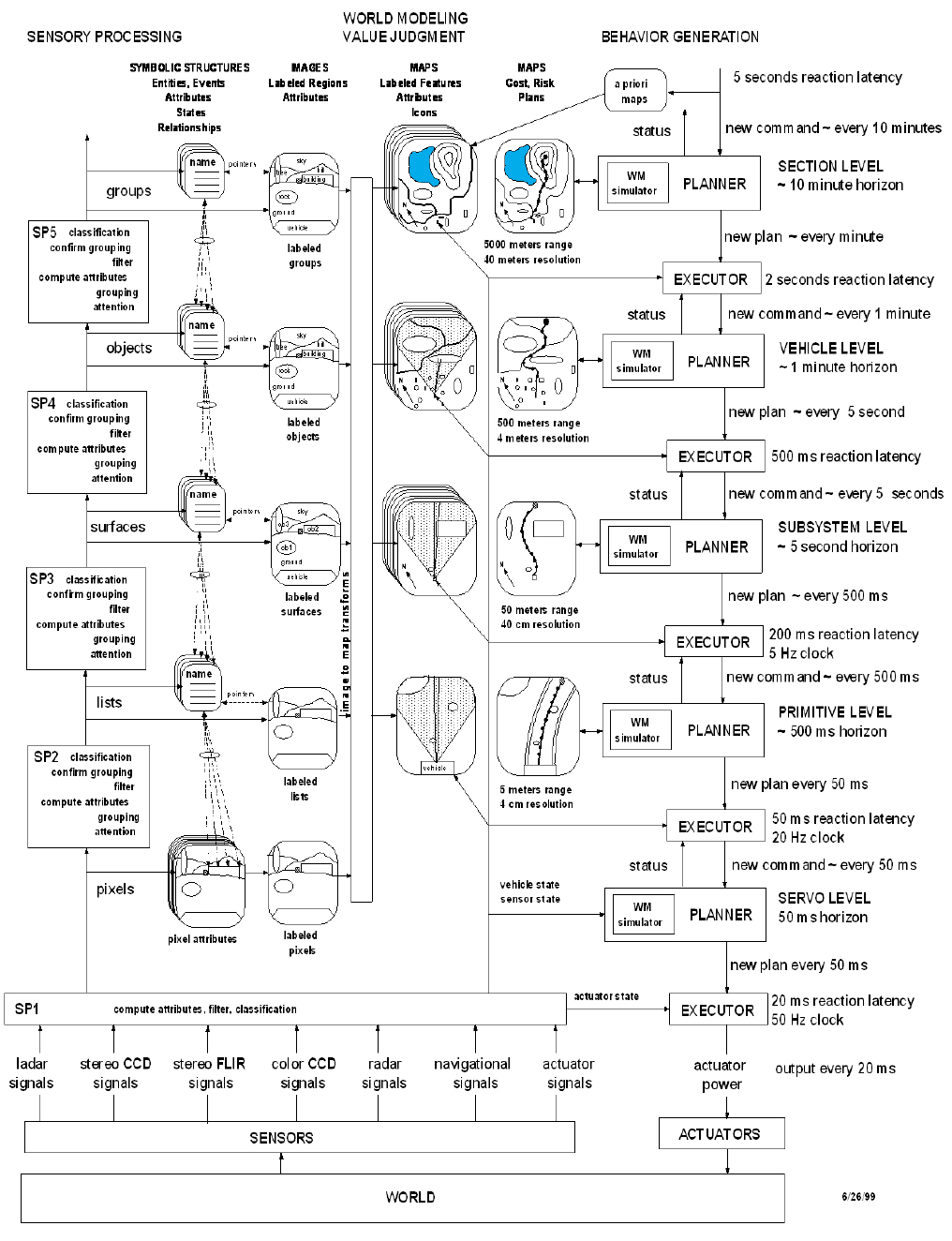 Behavioral task decomposition means that each level in the computational hierarchy generates a plan leading to an executor ordering the corresponding behavior in the system being controlled (e.g., a robot or weapon or decision-aide display). As illustrated in Figure 2 (designed for a robotic vehicle application), the planning horizon is longer at the higher levels (e.g., 10 minutes or 10 hours) than the lowest levels of the hierarchy (e.g., 20 msec or less), and the plan's resolution or detail is lower at the higher levels. For example, if the top level wants to move in the sequence “ABCD,” then “AB” must first be achieved, which requires that “A” be performed, which requires (for example) that the system achieve state “A”, which requires that a certain mechanism be activated. The cycle time at the lower levels is much shorter than at the higher levels (e.g., milliseconds versus hours).