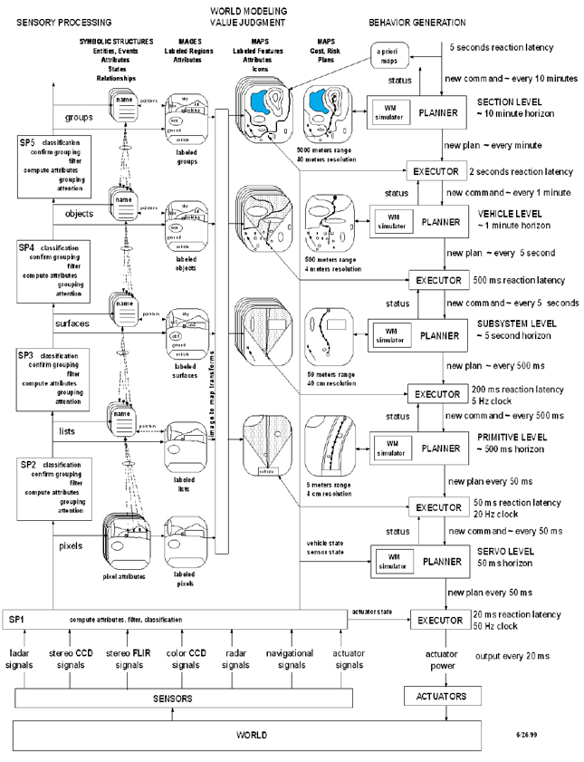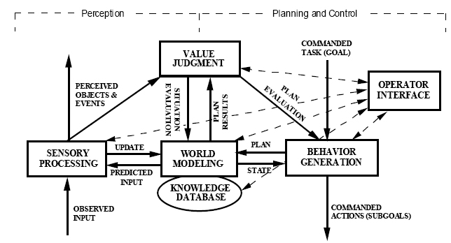 The world model is a best estimate of the state of the world, including the state of the control system itself. Task modules at the same level shared information about the state of the world, but different levels access different parts of the world model. Expert systems (i.e., symbolic or rule-based systems) may reside at the top two or three levels. The bottom level makes use of conventional control theory to operate variables of suitable mechanisms (e.g., wheels, propellers, or servos). The top of the hierarchy can accommodate programs for achieving cooperative behavior among several autonomous vehicles, but a single vehicle can also be accommodated. The world model is closely coupled to the value judgment module, which determines and updates priorities.